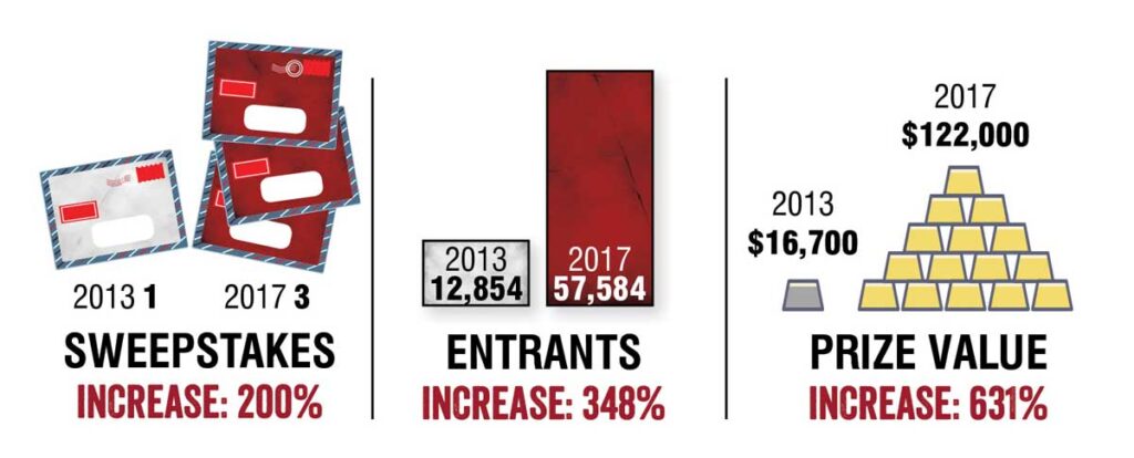 F’s national sweepstakes program, the equation has been simple enough to follow. Offer more pr