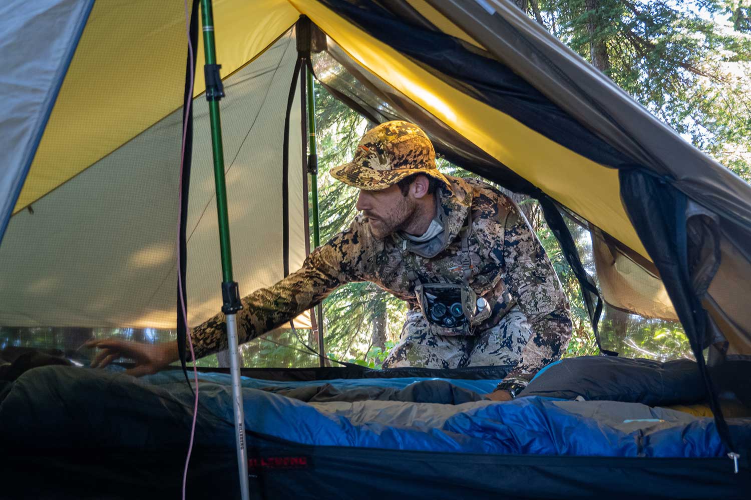Jon also calls out that weight savings can be done by choosing a single vestibule model. “I will almost always go for a two-vestibule tent,” he says, “because they offer the most comfort and flexibility. But you can save weight with single vestibule models and still have plenty of comfort.” Again, he identifies to similar models across the Hilleberg Label system, the Black Label Nammatj (2 and 3 person), the Red Label Nallo (2, 3, and 4 person) and the Yellow Label Anjan (2 and 3 person). “The Nammatj is just as strong as the Keron but weighs less. In many ways, I think the Nammatj tents are our most versatile: strong enough for anything and easily light enough for general use,” says Jon. “The Nallo is a great choice when you do want to keep the weight down but still need all-season capability, like on mid- to late-season hunts in the high country in Washington. For warmer conditions, I love how light and airy the Anjan is, and again, the Anjan 2 makes a super roomy and still very light solo tent.”