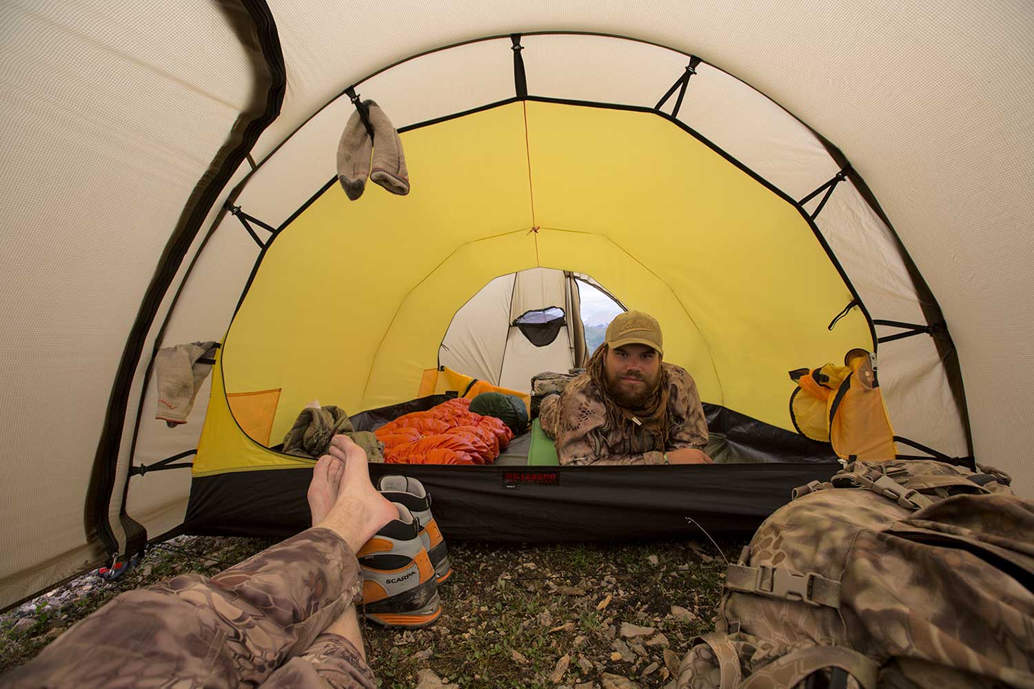 Jon uses similar models across the Labels to illustrate his point: the Black Label Keron (3 or 4 person), Red Label Kaitum (2, 3 or 4 person) and Yellow Label Helags (2 or 3 person). “All of these are two-vestibule tunnel tents that share the same appealing characteristics: maximum interior space, excellent flexibility because of the two entrances, and tremendous space to weight ratios,” he says. “If I were doing a late-season hunt in Alaska or the bigger mountains in BC or Montana, or if I were tying snowstorms to tracking Elk, I’d take a Keron. It might weigh a bit more, but the security in the face of real weather is priceless.” For general, all-around trips or hunts anytime, he’d opt for the Kaitum. “It’s strong enough to handle anything I’d likely encounter, it’s super comfortable, and, if the weather changes from cold to hot – as it can in the mountains – being able to fully roll back both of the Kaitum’s vestibules gives amazing versatility.” On any hunt where snow is only a remote possibility, Jon calls the Yellow Label Helags tunnel tent “hands down one of the best hunting tents there is. I recently did a trip with a buddy of mine where we used a Helags 2. He told me that he was more of a ‘dome tent guy,’ but when he climbed into the Helags his first comment was ‘Whoa! Where did all that room come from.’ I’m 6 ft 6 in, and he’s 6 ft 2, and we were incredibly comfortable.”