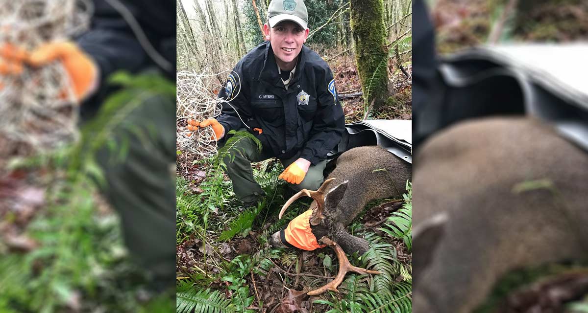 Two members of the Washington Department of Fish and Wildlife (WDFW) answered a call from a landowner who saw the buck with wire tangled in its antlers. It apparently got that way after coming in contact with a 4-foot tall electric fence surrounding a vegetable garden. It then ran across a field, dragging about 200 feet of wiring behind it and getting severely entangled in a number of trees and shrubs.