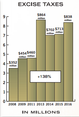 Pittman-Robertson excise taxes rose from $352 million in 2008 to $838,059,600 in 2016, marking a 138 percent increase.