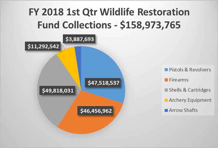 Data provided by the U.S. Fish and Wildlife Service and published by the Wildlife Management Institute shows a 33 percent drop in the amount of firearms and archery equipment sold over the first quarter of fiscal year 2018 (October 1 through December 31, 2017) compared to a year ago. If you do that math, that’s a shortfall of $79.4 million in excise taxes. Specifically, pistols and revolvers are down 33 percent, firearms are down 35 percent and shells and cartridges are down 37 percent. Archery equipment is down 13 percent but arrow shafts are up 20 percent.