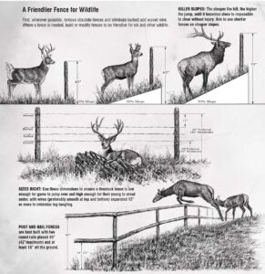 What about rail fences? A standard post and rail fence can be easier for elk to jump if it’s no higher than 42 inches and there’s room for young ones to slip under. But three-dimensional (i.e. triangular) buck-and-rail fences or, worse, buck-and-wire fence, can be a nightmare for elk to navigate. These can be modified by dropping one end of the top rail to the ground in some sections, leaving a small gap for wildlife, or building the fence with two rails only, bolted at 18 inches and 40 inches, and leaving off the internal rub rail in alternate sections so the fence is easier to crawl over.