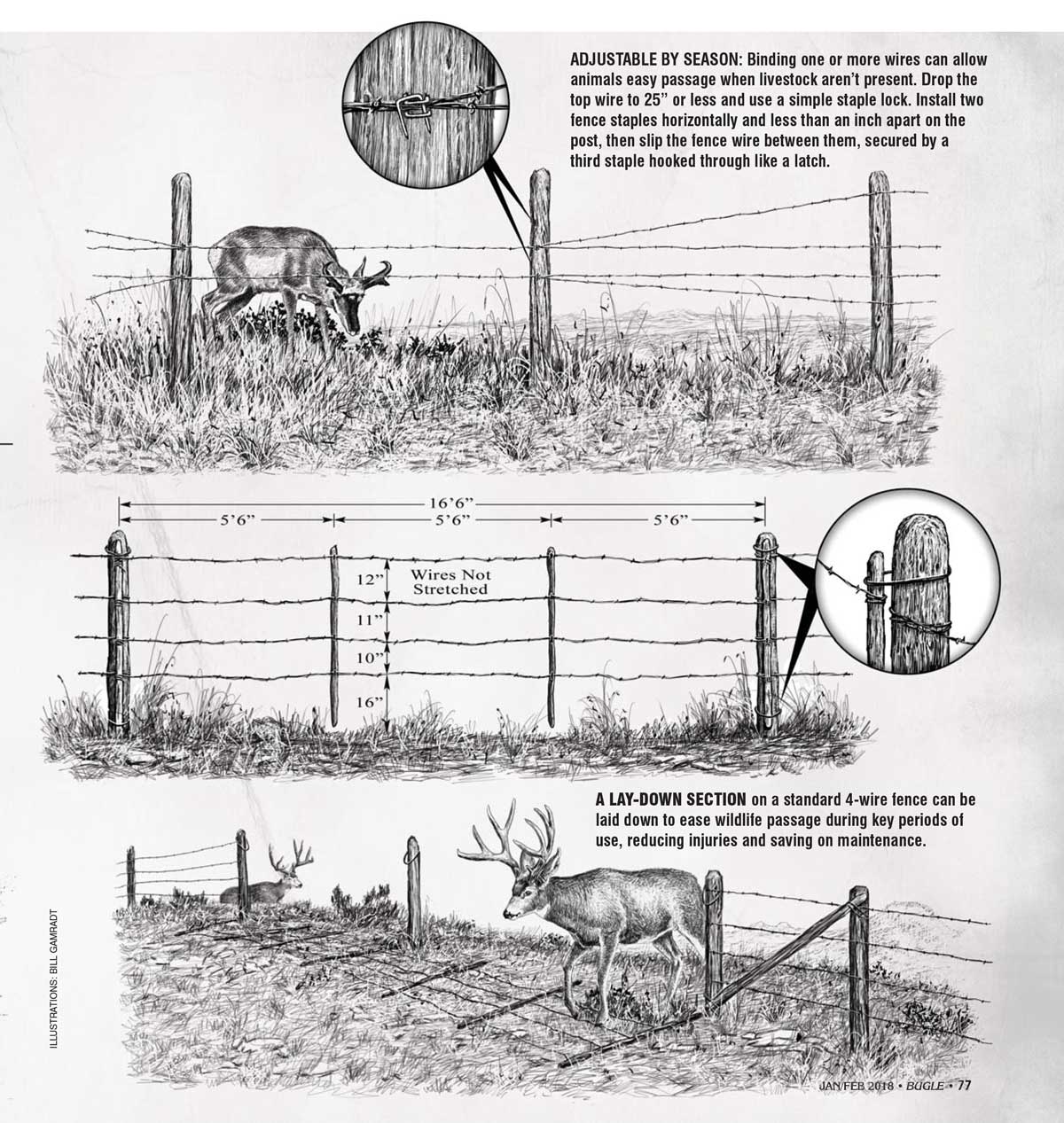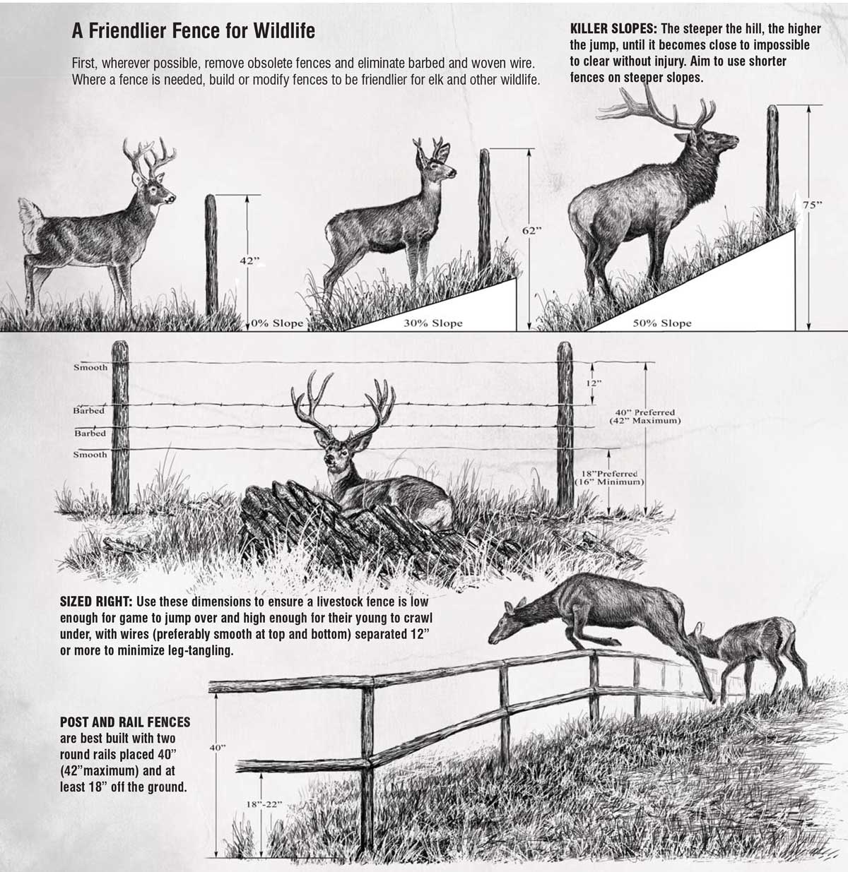 Yet fences are necessary in many situations. Luckily there are proven techniques to make both existing and new fences easier on wildlife. The goal is to create fences that are low enough to jump, high enough to crawl under, less likely to tangle legs and highly visible—yet still retain their function. There really isn’t a single fence design that will fit every situation, and landowners and land managers are ahead to tailor their fence design to specific needs and terrain. But the following ideas offer some solid benchmarks.