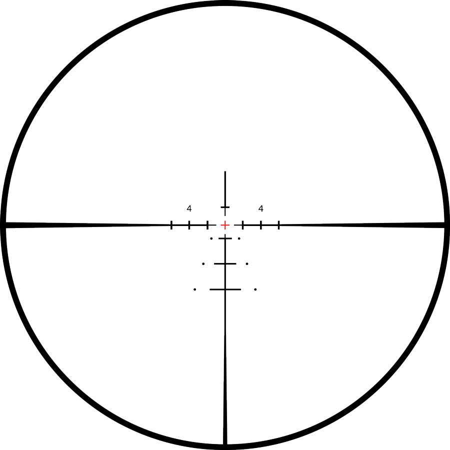 If we take a small step up in complexity, we get to the BDC or Bullet Drop Compensating reticle. This is simply a standard crosshair reticle that has a few dots or hash marks denoting bullet drop. Some will be designed for specific calibers but the majority are marked out in Minutes of Angle. The idea of this is to have a basis for determining hold over without doing much in the way of math. It’s an educated Kentucky Windage but for elevation.