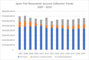 Statistics supplied by the Wildlife Management Institute focus on funds generated from 2007 to 2019. Money from the Sport Fish Restoration Account (Dingell-Johnson Act) collections on fishing equipment, boat motors and boat fuel tax totaled approximately $700,000 in 2007 and slightly dipped through the years but remained above $650,000 in 2019.