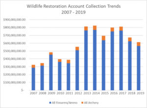 On the other hand, collections from the Wildlife Restoration Account (Pittman-Robertson Act) on guns, ammunition and archery equipment totaled just above $300,000 in 2007, spiked to more than $800,000 in 2013 and 2014, but dipped to a little more than $600,000 in 2019. While funds generated almost doubled from 2007 to 2019, the drastic reductions since 2017 are what is causing budgetary shortfalls.