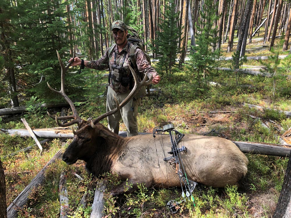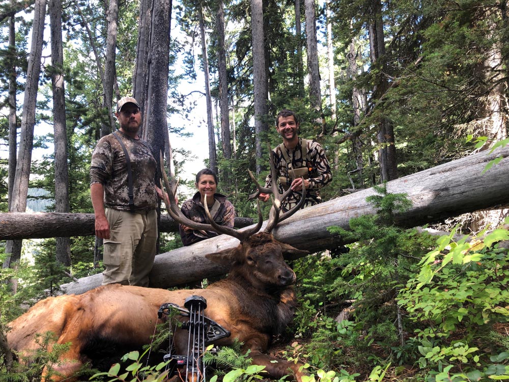 This fall, in 2022, on Day 2 of a 4-day hunt we heard a bugle just after sunrise.  We decided it would be best to split up into two groups, and Mark suggested, “Why don’t you and Jordan run up there and get that bull while Jessica and I stay down here and listen in case he moves on.”  Game on.  Jordan and I set off, hiking quickly up the trail and bugling here and there to confirm we were heading in the right direction.  We were able to find a fairly decent spot to set up, and carefully worked in between the bull and his small herd of cows.  Jordan set up 10 yards behind me, and let out one of his textbook bugles.  Immediately the bull responded and was close, just where we’d last heard him.  After a few more bugles, the bull came into the 30-yard window and I arrowed the bull.  Bull #4 down.  Another beautiful dark-antlered timber bull aged at five-years-old.