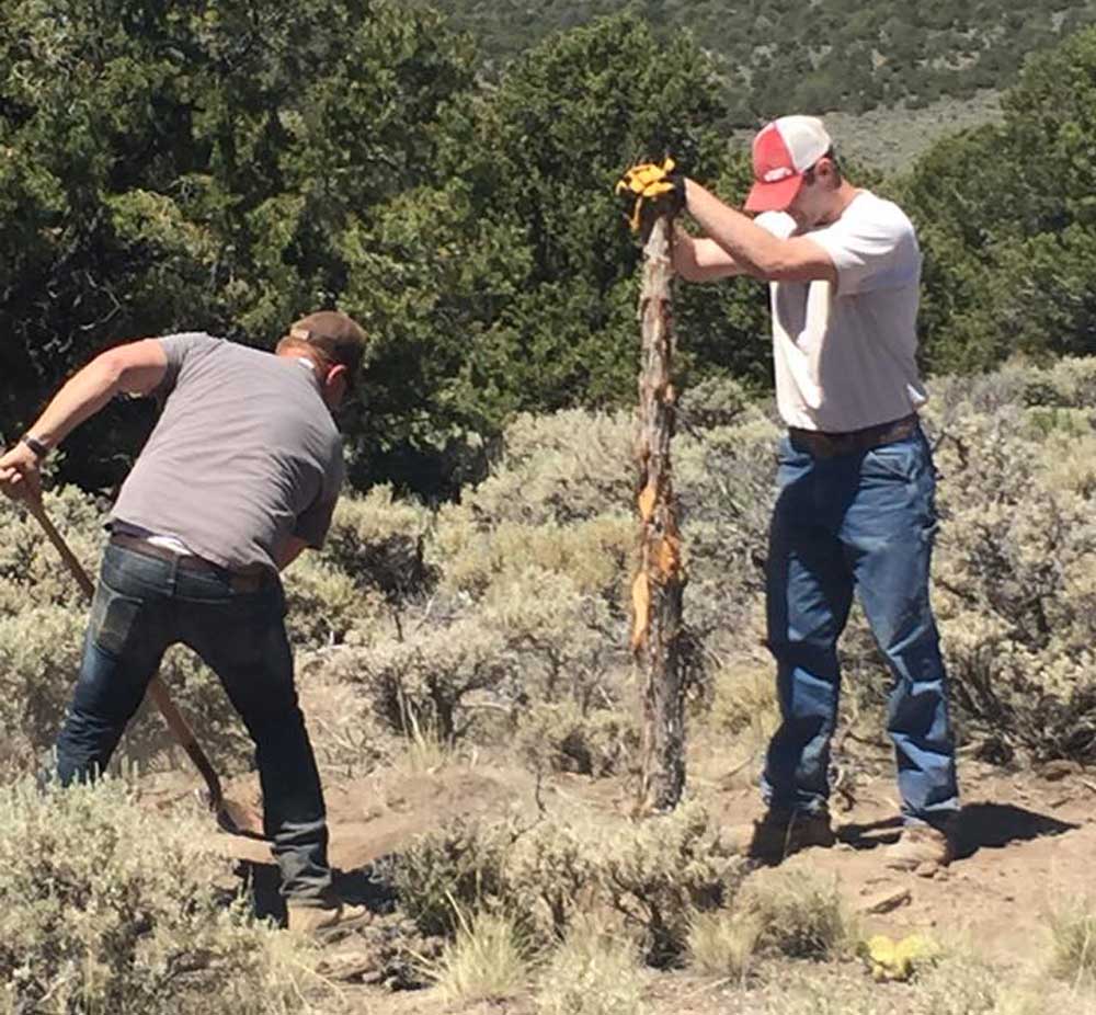 Men, women and children worked together on Monroe Mountain to erect fence posts and construct the guzzlers. One of them now sits on the east slope of Blue Peak and the other is a 1.25 miles away.
