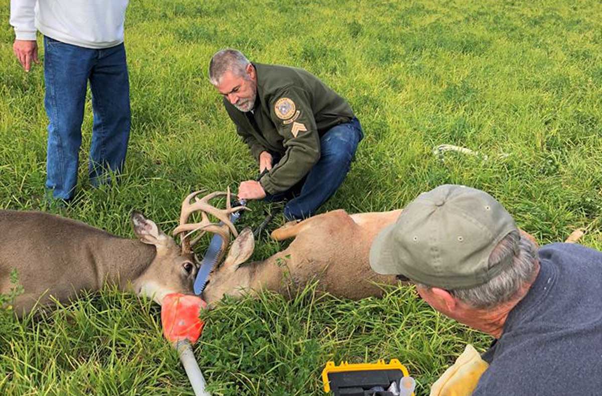 Today FWP office staff received a call from the public about two bucks that had their antlers locked together. When an FWP game warden arrived, he found that one of the bucks was dead but the other was still very much alive and fighting to get free. The warden used a catch pole to hold the live buck down and, with help from folks who were there, administered an anesthesia using his own designed Iso Pole. With the buck held and under sedation, he cut away the antler from the dead buck and was able to free the live buck.