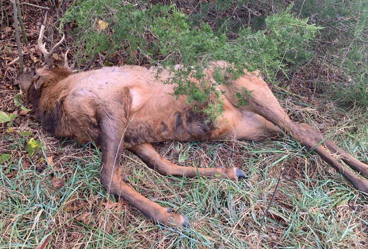 Shannon County Conservation Agent Brad Hadley found the adult bull elk shot and left near Klepzig Mill in Shannon County over the opening weekend of Missouri’s firearms deer season, Nov. 11 and 12. The entire animal was left in the field. The carcass was transported to MDC’s Central Regional Office and Conservation Research Center in Columbia for necropsy.