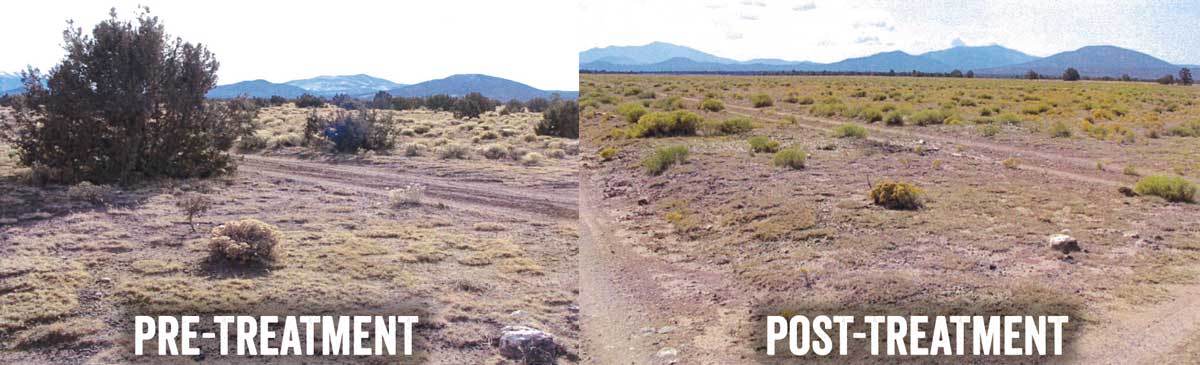Babbitt Ranches provided a skid steer with carbide teeth mounted on a drum which rotate at a high speed to shred trees that leave wood chips behind to serve as mulch which helps retain soil moisture. The resulting removal of trees leads to less competition for soil moisture which translates into more forage for wildlife and livestock.