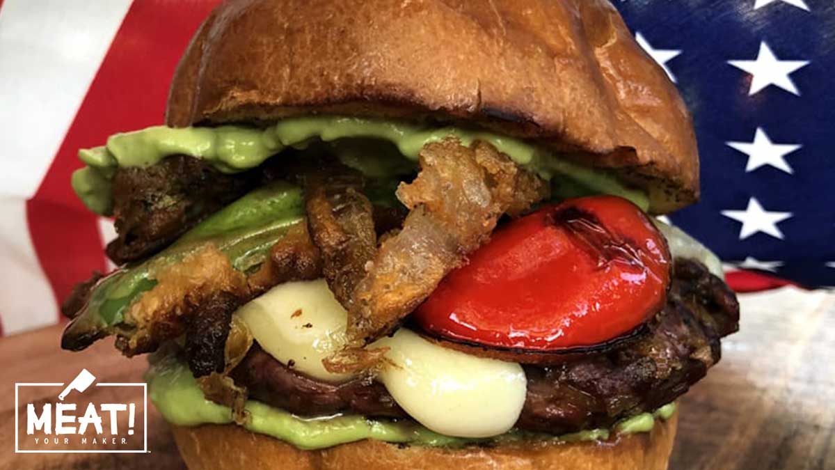 - Set the patties on the grill grates for about 5-6 minutes per side. Top each one with a slice of white cheddar cheese, fried onion rings and an Anaheim pepper. Continue grilling until cheese is melted.