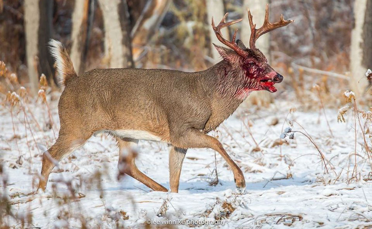 Bucks often face off during the breeding season, or rut, with rivals to determine dominance hierarchy. The testosterone-filled sparring matches are usually rather short-lived but some, as you see above, can have painful or even deadly results.