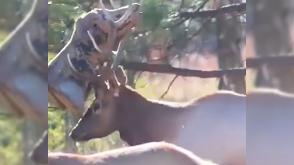 A bull elk has some sort of decoy jammed between its antlers. Captured on video and posted on the Outdoor Life Instragram page, the animal seems rather nonchalant about the issue as it moves about with the rest of the herd, seemingly without a care.