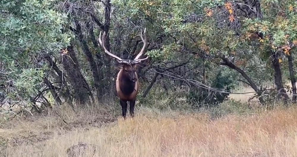 Two wires wrapped around the animals’ antlers were also wrapped around a nearby telephone pole. When officers arrived, the bull calmly stood about 20 yards from the pole. It was obviously exhausted.