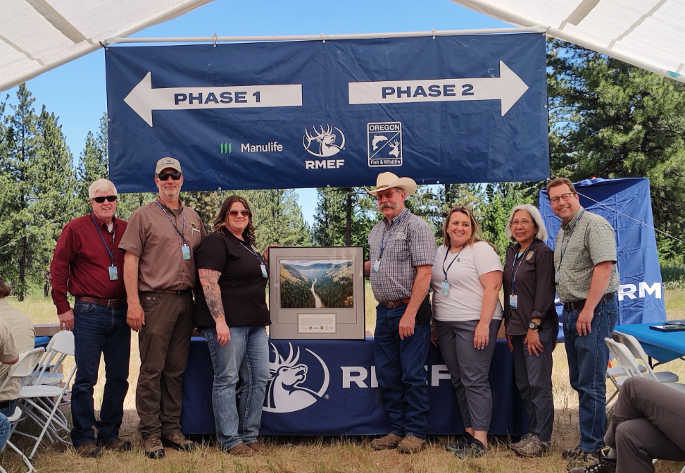 Representatives of the Rocky Mountain Elk Foundation, Manulife Investment Timber and Agriculture, Oregon Department of Fish and Wildlife (ODFW), elected officials, US Forest Service and US Fish and Wildlife Service representatives, Nez Perce tribal officials, other dignitaries, donors, sportsmen and women, RMEF members and volunteers, and the general public gathered to celebrate a land conservation and access project decades in the making. The two-part Minam River Acquisition, completed in late 2024, conserved and opened public access to a combined 15,573 acres of wildlife and riparian habitat.