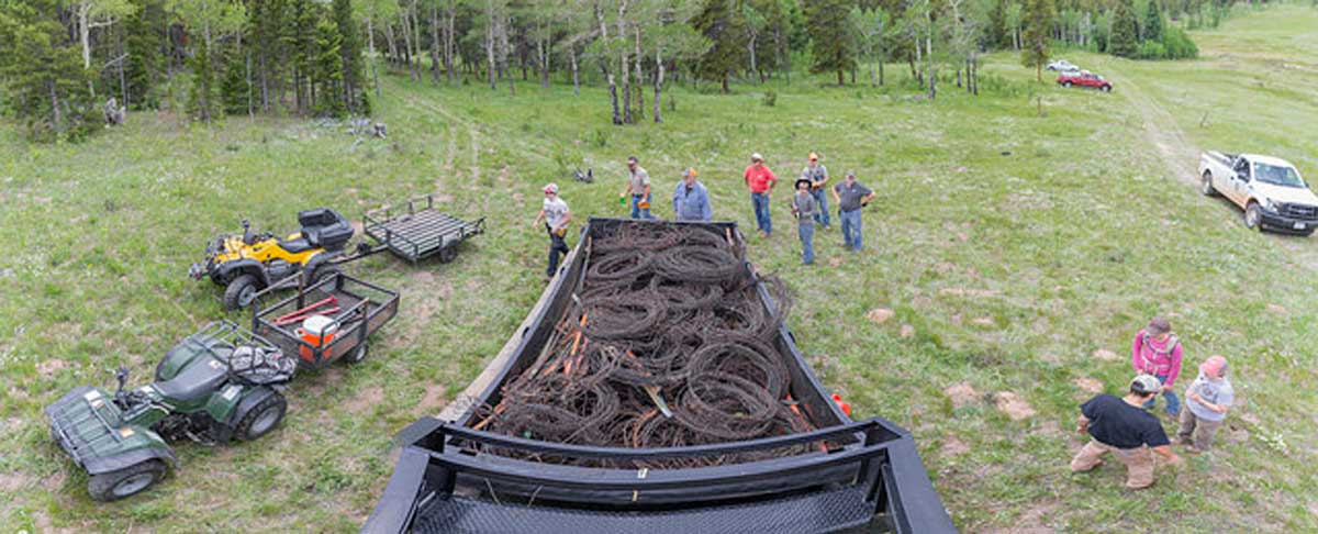 The volunteers endured showers and slogged through boggy conditions to remove an estimated one ton of rusty, brittle barbed wire and old fence posts that previously covered about two miles of acreage in north-central Colorado’s Golden Gate State Canyon Park. (Park access is limited but some hunting permits are available for elk management purposes.)