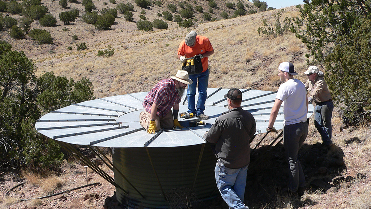 To the uneducated, it looked like something out of a sci fi film – a metallic contraption with a round, winged top pointing toward the heavens, sitting on the side of a barren New Mexico mountain. In reality, it’s a uniquely-designed water catchment system. In other words, a gizmo that collects and stores water when the rains come that provides life-sustaining liquid for elk and other desert creatures in need of a dependable water source.