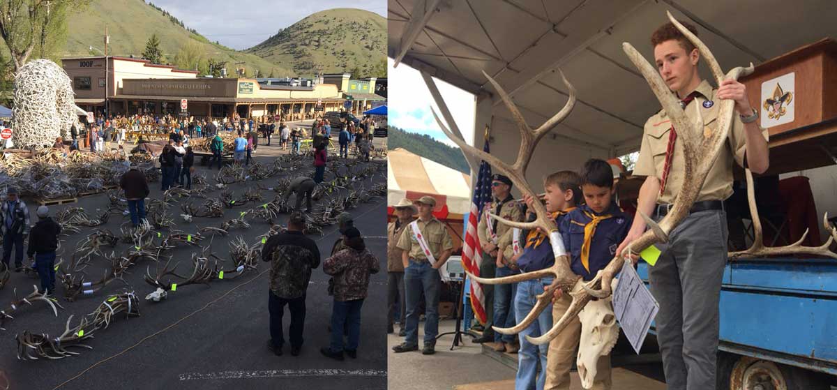 National Elk Refuge staff, Boy Scouts and other volunteers start gathering the antlers as they are shed beginning in mid-March. Seventy-five percent of the proceeds go to the U.S. Fish and Wildlife Service for habitat enhancement work at the refuge while the remainder goes to the Jackson District Boy Scouts. The refuge also sells the antlers year-round to visitors.