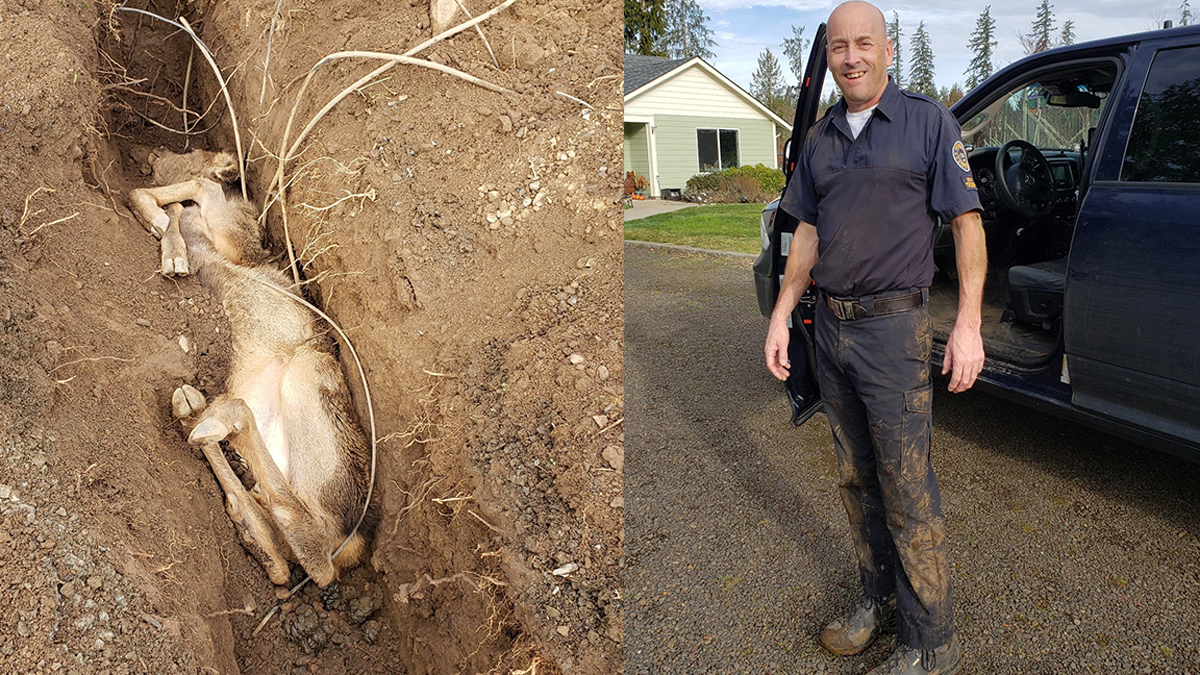 On January 16, 2022, Oregon State Police Fish & Wildlife Sr. Trooper Rzewnicki received a call from dispatch that a landowner and contractor in the Knappa area (80 miles northwest of Portland) had reported a deer was stuck in a ditch he had dug for wires, leading to some new home construction.