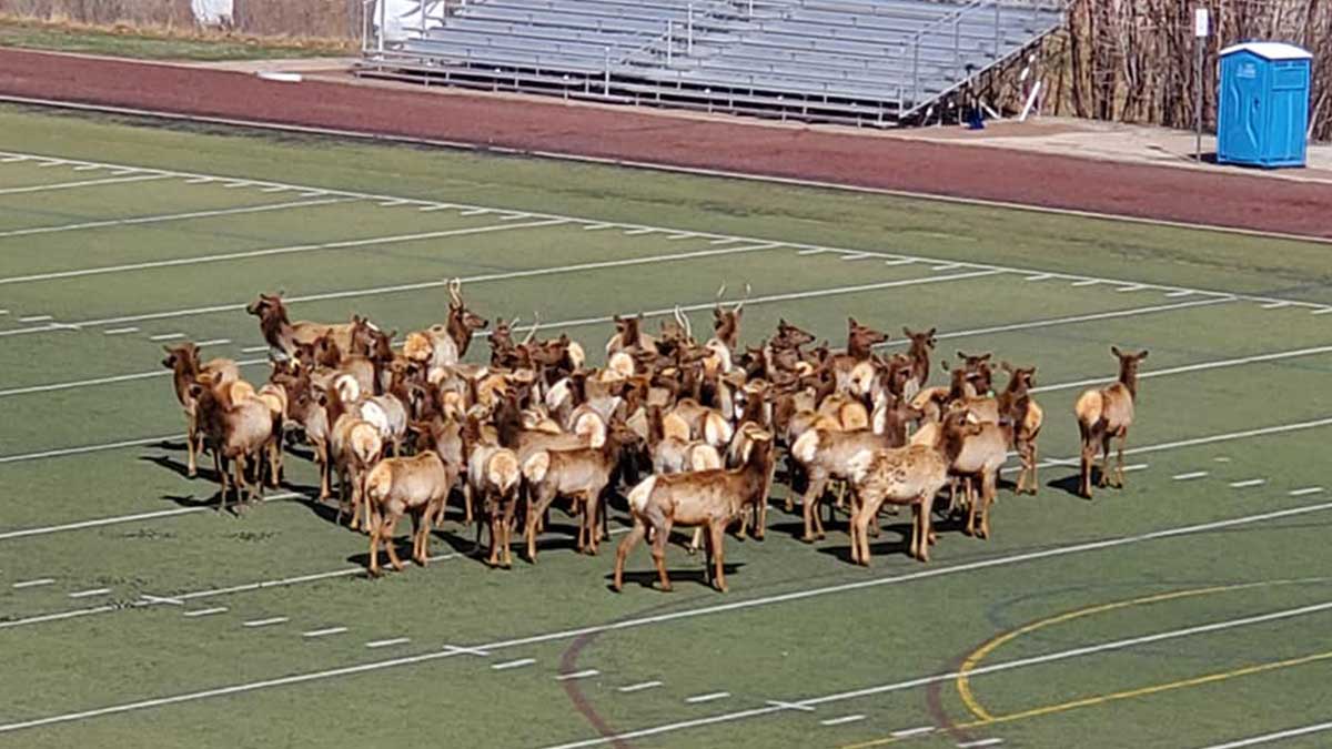 A herd of elk poured onto the artificial turf. One onlooker said the animals stayed there for about five hours before moseying off to greener, and undoubtedly, more lush grazing land.