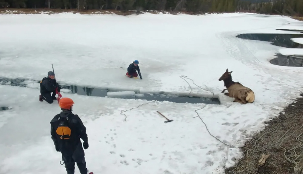 Unfortunately, it’s becoming a common occurrence. Elk trying to cross the Bow River in Banff, Alberta, fall through the ice, cannot get out on their own and simply tread water until help comes or they eventually succumb and drown.