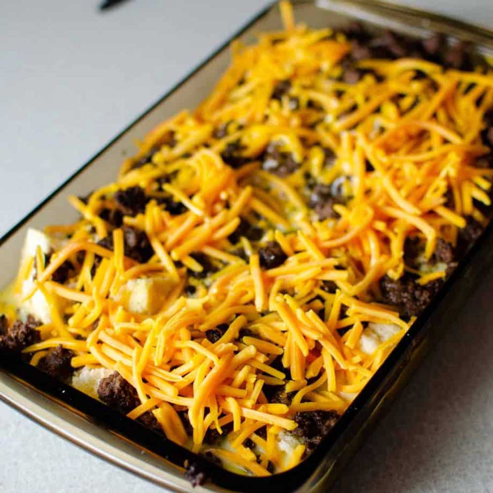 - Add the sausage, biscuit cubes, and shredded cheese, and stir to coat evenly.