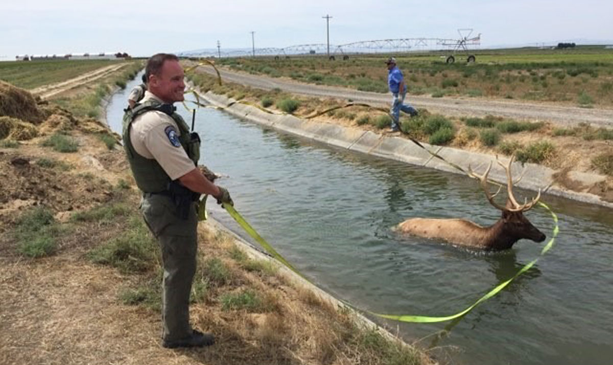 Here is a perfect example. On August 29, 2019, two WDFW officers received a call about a bull elk that couldn’t get out of an irrigation canal with cement walls in southeastern Washington. They used a couple of straps, attached them to the elk and then went “fishing.”