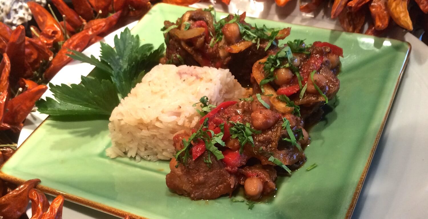 Lightly season the diced meat with salt and pepper (or your own favorite dry rub) and dust with the flour. Heat the olive oil in a heavy-gauge sauté pan. Brown the meat in small batches. Once browned, remove to a crock or braising pot. After the meat is browned, deglaze the pan with the red wine. Scrape the bottom of the pan to collect any unburned caramelized meat particles and add to the pot with the meat. To the pot, add the stock, garbanzo beans, tomato paste, toasted spices and bay leaves. Bring this to a slow simmer, removing any scum, fat or oil that forms on top. Continue to braise for about 1 ½ hours uncovered.