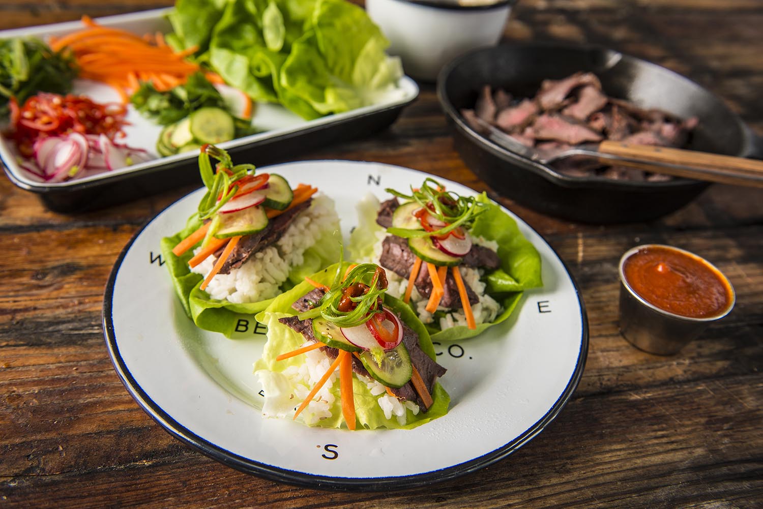 Marinated venison steak is grilled and served with fresh lettuce cups, rice, carrots, cucumbers, kimchee, fresh cilantro and topped with chili sauce.