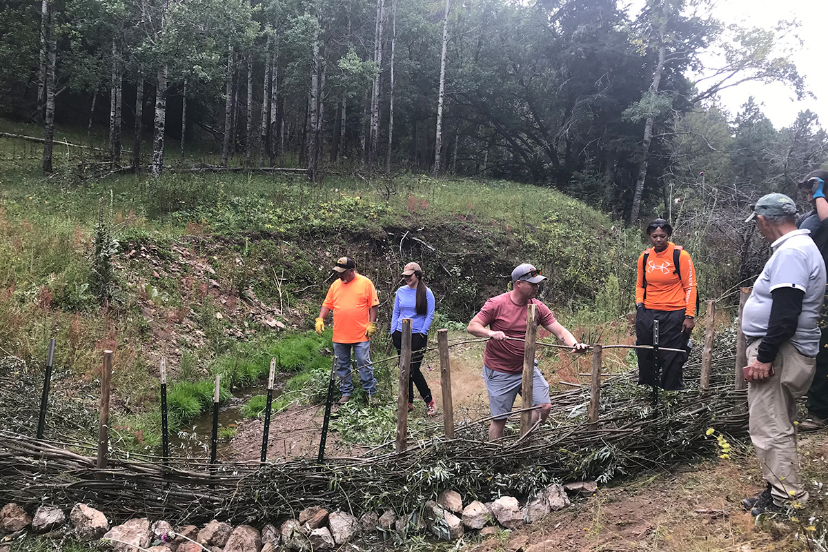 In the fall of 2021, some 275 miles to the east in southcentral New Mexico, RMEF volunteers wholeheartedly tackled a completely different type of task. They gathered in the Lincoln National Forest to build and install four beaver dam analogs. What are those, you ask? They are man-made devices meant to mimic the structure of a beaver dam.