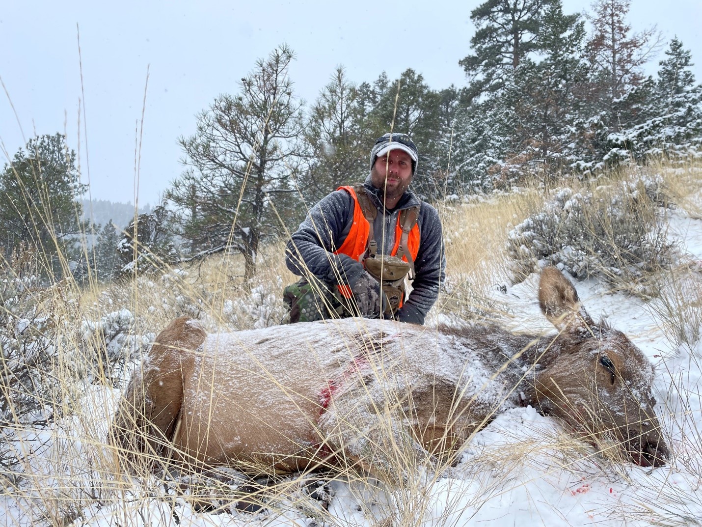 I took the time to snap a photo—an image that drew the ire of my photographer friend for the ill-advised placement of a strand of bunchgrass cutting through my face. But still, I look at the photo, a young cow taken cleanly as the departing storm dropped its last round of flakes, and truly felt like I was out among ‘em, both in the hills with the elk but also part of this community of hunters celebrated every day by RMEF.