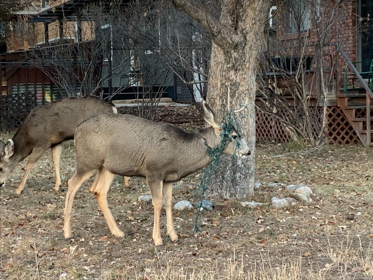 CPW recommends holiday lights and decorations be placed higher than six feet or attached tightly to trees and buildings. Lights or webs that hang low or are draped insecurely over vegetation easily get tangled in antlers.