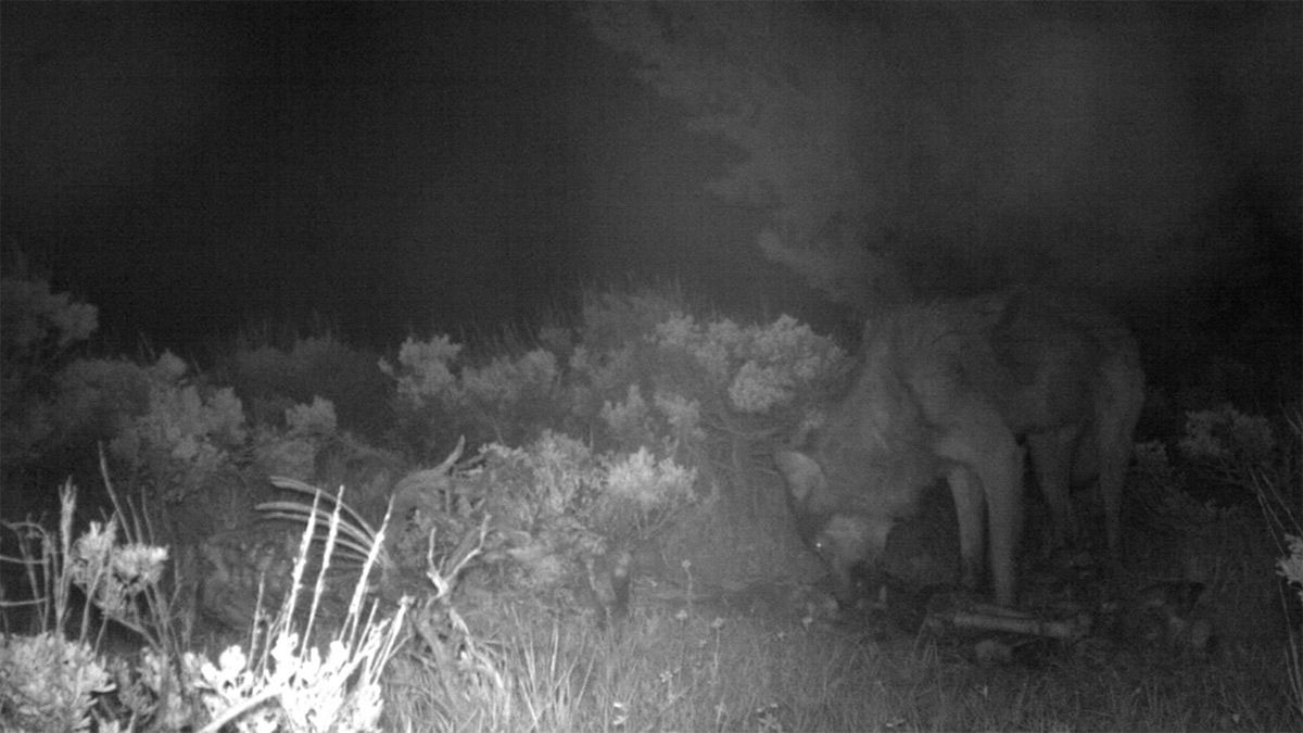 Wildlife managers were able to recently capture an image of a lone wolf feeding on an elk carcass in the area. Only one wolf was seen over several different nights so it is unknown if the wolf is a member of the known pack or the animal is a new lone disperser into the area.