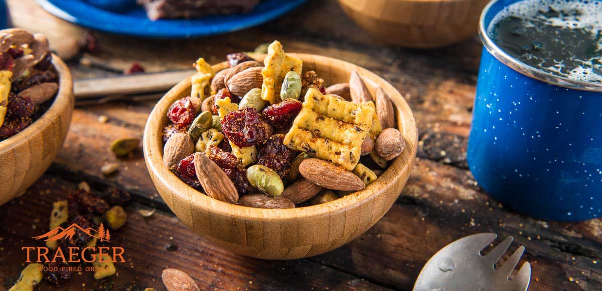 In a bowl, mix almonds, shelled pistachios and sunflower seeds, then mix in clarified butter and Traeger Big Game rub.