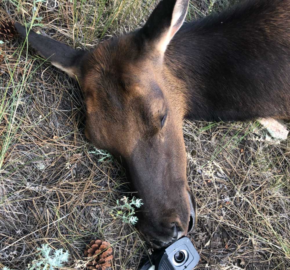 Officers recently answered a call about a cow elk with a small rat trap stuck to its upper lip. The animal apparently smelled bait intended to lure and capture a rodent and instead triggered the trap’s mechanism on itself.