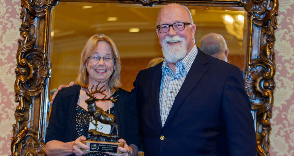 Recognizing her dedicated elk research spanning three decades and her long-standing support, the Rocky Mountain Elk Foundation honored Evelyn Merrill as its Excellence in Elk Country–Wildlife Researcher/Biologist. The presentation took place at the 12th Western States and Provinces Deer and Elk Workshop in Sun Valley, Idaho, in May of 2017.