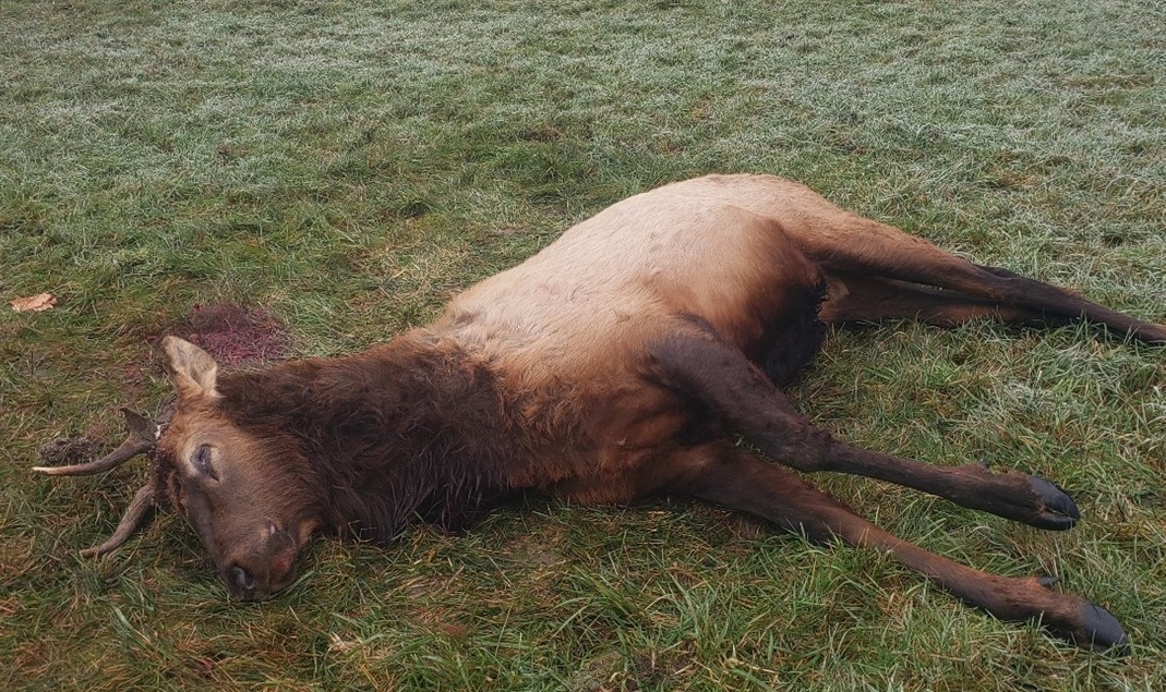 The Oregon State Police Fish & Wildlife Division is asking for the public’s help to identify a person of interest related to a Roosevelt bull elk that was unlawfully taken and left to waste sometime between 5 p.m. on Nov. 28, 2023, and 7 a.m. on Nov. 29, 2023. The large bull elk was left to waste on Dutch Canyon Road near Scappoose (about 20 miles northwest of downtown Portland) with no effort to remove any meat. This bull was well known and considered to be part of the Miller Herd.