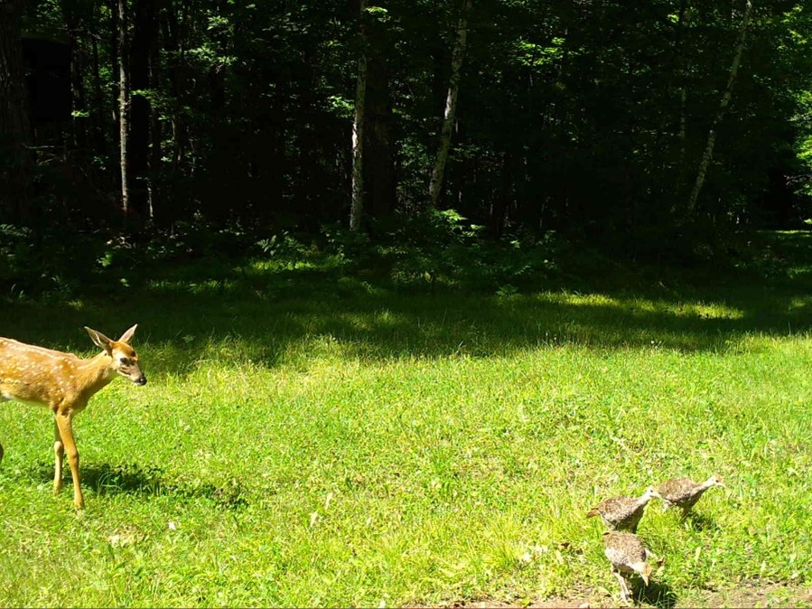 Snapshot Wisconsin uses trail cameras to better understand wildlife populations and animal behavior that might be otherwise difficult to observe, such as the fawn and poults above taking a stroll together.