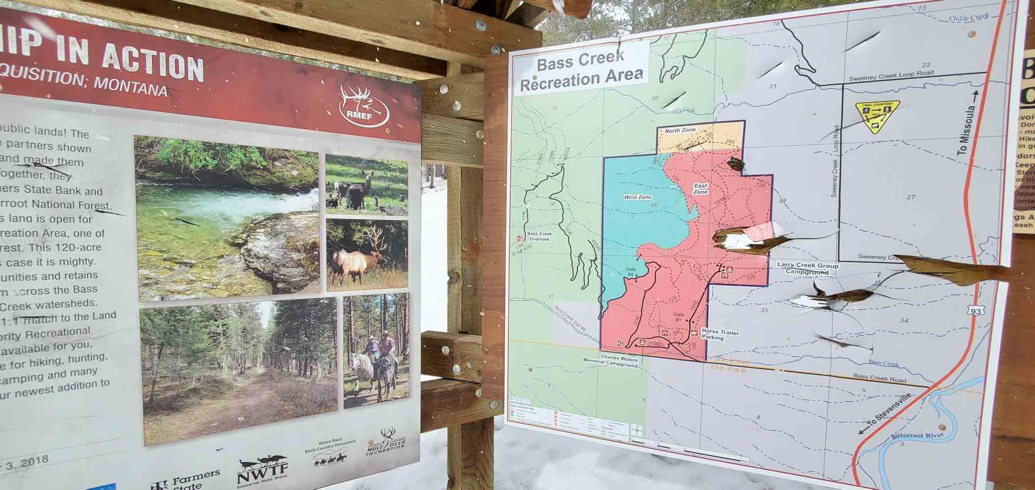 Authorities in western Montana are looking for information about the person(s) responsible for using an ax or a hatchet to damage several signs at a kiosk in the Bass Creek Recreational Area. Among other things, the signage highlights a project carried out by the Rocky Mountain Elk Foundation, Bitterroot National Forest and other partners.