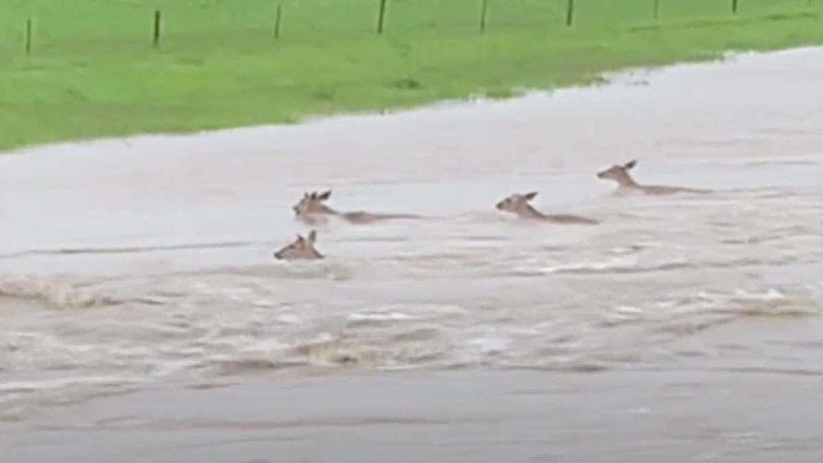 It’s a good thing deer know how to swim. A man driving across a bridge over a flood-swollen river in South Dakota captured video of four deer fighting to keep from being swept downstream.