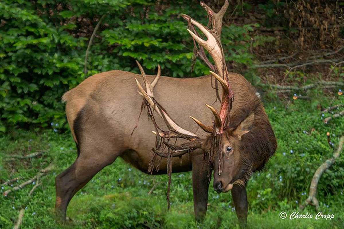 No, not after your kids use a couple of old sheds in a sword fight, but in late August. It is then bulls shed the velvet skin that has encased their growing antlers for roughly 150 days. Amazingly, they go from full velvet to hard brown antlers in less than 48 hours. When the wraps first come off, bull’s antlers are bright white and streaked with crimson blood. Rubbed against trees and shrubs and reacting to oxygen, they quickly stain a deep mahogany.