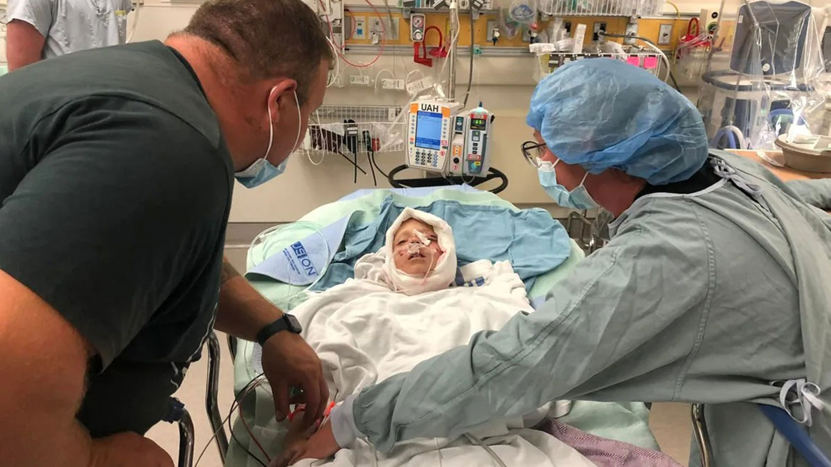 “We made it to the hospital just in time to kiss him, say hello and at the same time say goodbye, and hand him over to the surgeons where he spent 3.5 hours in surgery. Over 200 staples and surgical clamps, and many more stitches over his face, neck, and head,” Chay Feuser wrote in a Facebook post.
