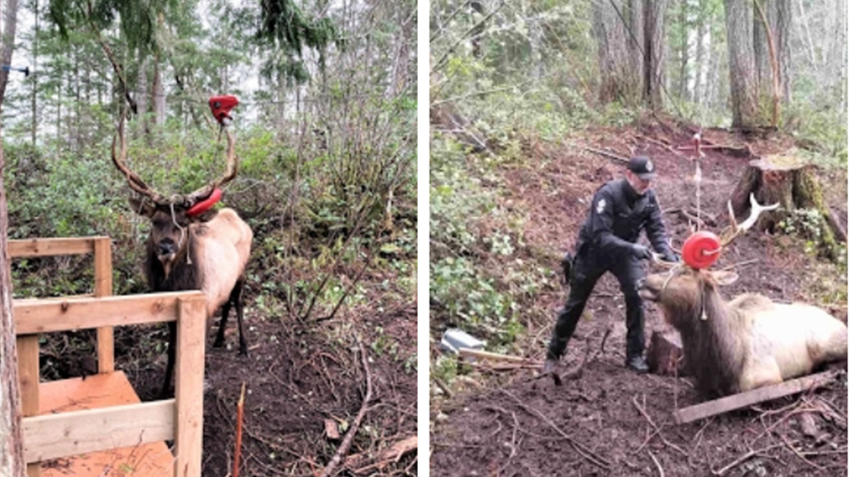 An overly curious bull elk needed some help to get untangled from a private zip line. It happened in a small town on the north shore of Cowichan Lake on Vancouver Island, British Columbia.