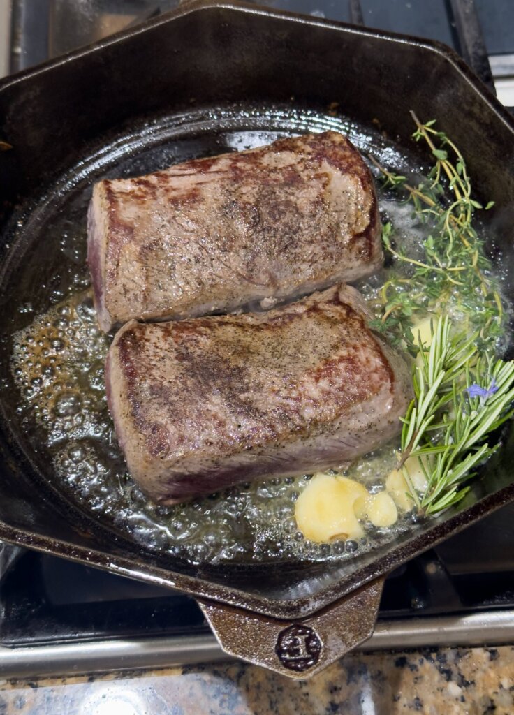 Steaks: Pat elk steaks dry then season with salt and pepper. Fry with a drizzle of oil for 2 minutes. Flip and fry for another minute. Add butter, rosemary, garlic and thyme, then baste steaks until internal temperature reaches 130 degrees. Remove steaks from pan, let rest in foil for 5 minutes, then slice thin.